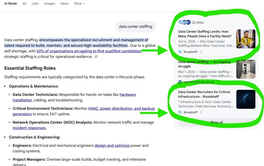 (When BroadStaff Global needed to dominate the data center staffing and fiber optics sectors, we delivered: achieving #1 rankings for 90% of their target keywords and 100% of their primary focus terms in AI Overviews and Google rankings.)